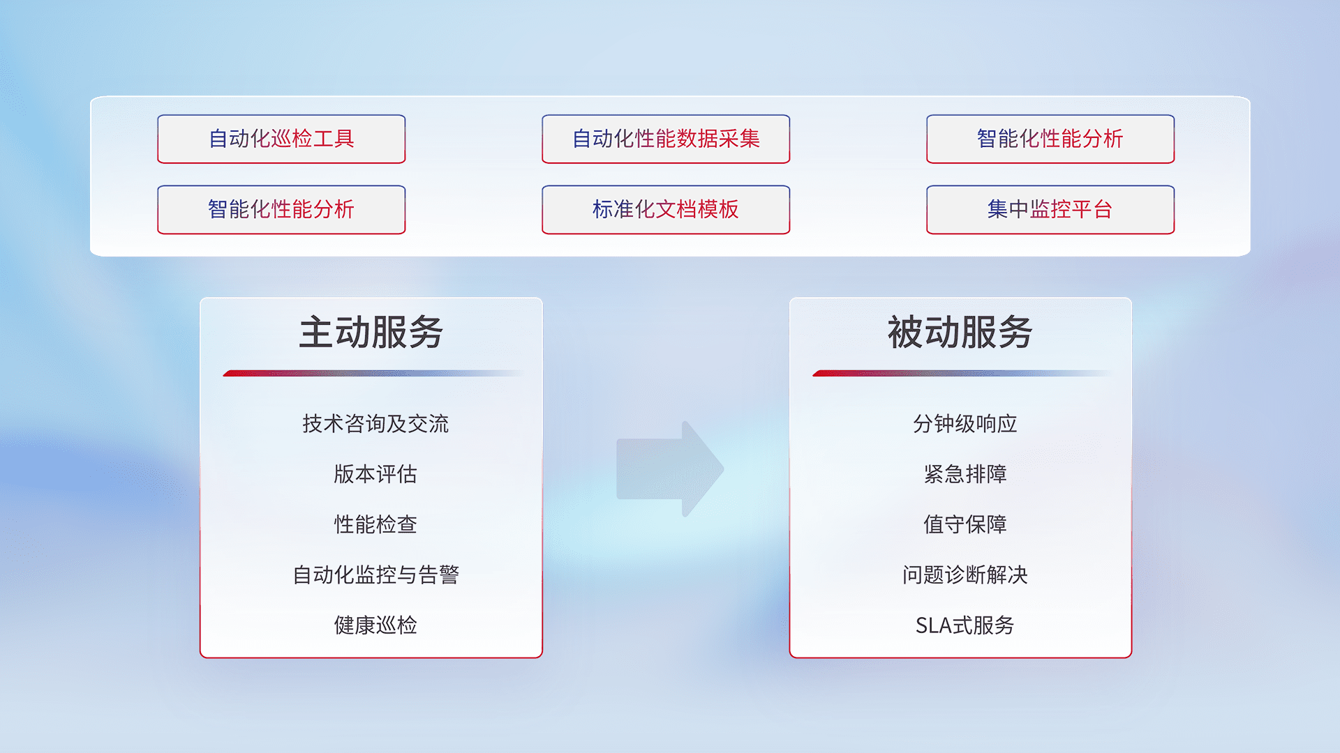 智能化工具和标准化文档,,,保障服务质量,,,提供主动服务(包含技术咨询、、版本评估、、性能检查、、、自动化监控与告警、、、健康巡检)和被动服务包含(分钟级响应、、、、紧急排障、、、、值守保障、、、、问题诊断解决、、SLA服务)。。。